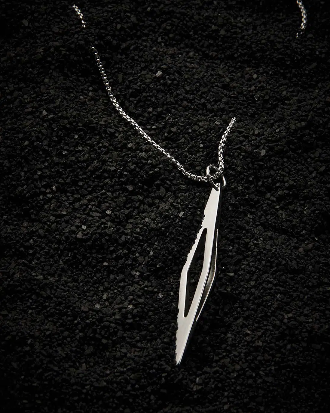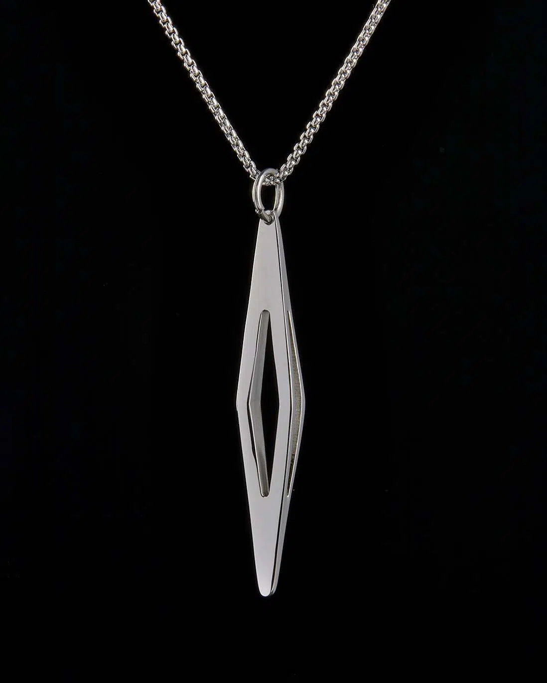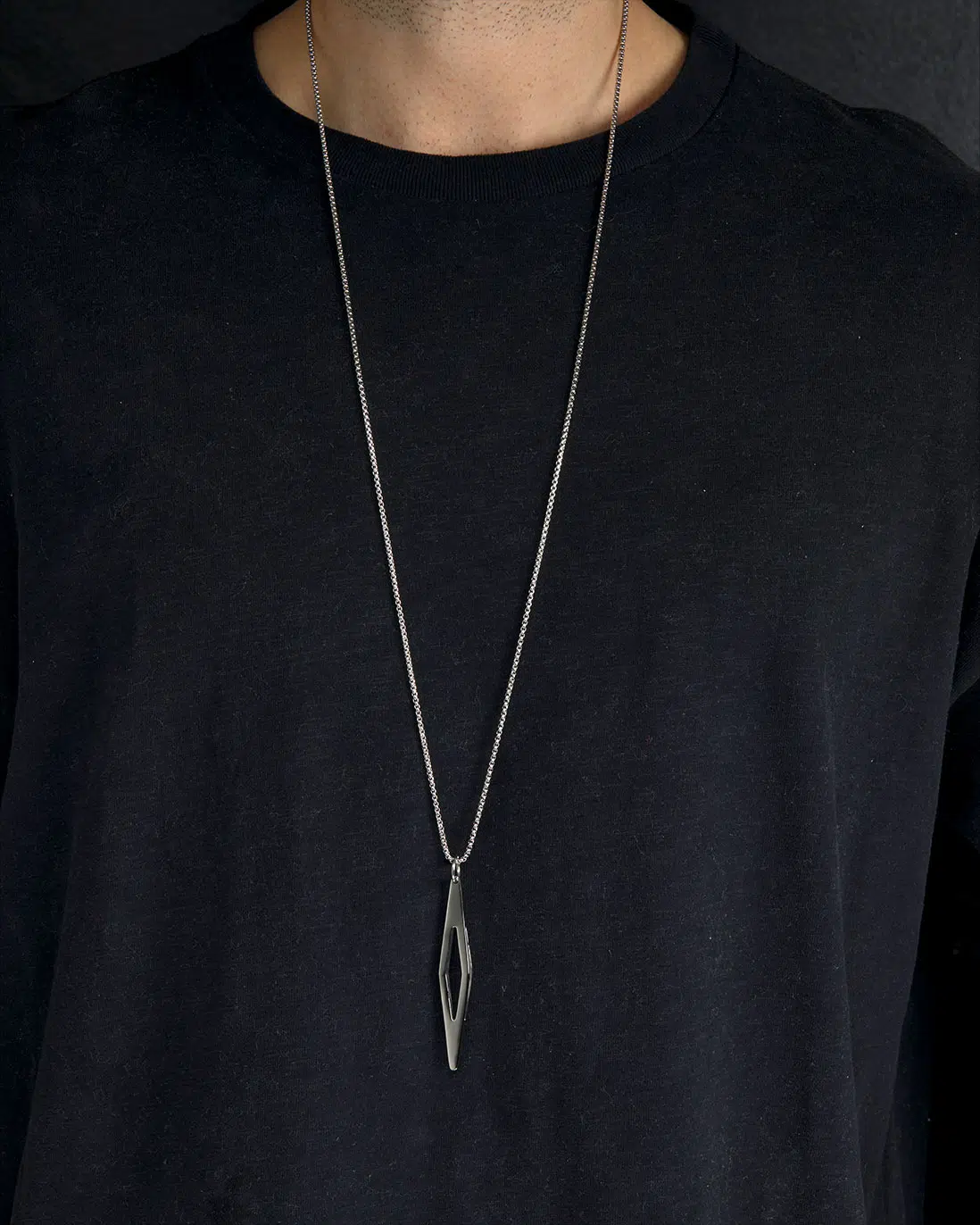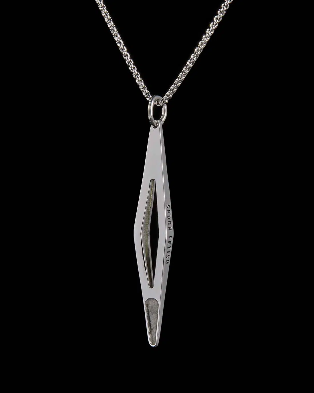 The Compass Pendant in Silver Tone is Accompanied by a 2mm Rounded Box Chain. Stylized Compass Arrow Look With a Hidden Spoon and Brand Engraving.